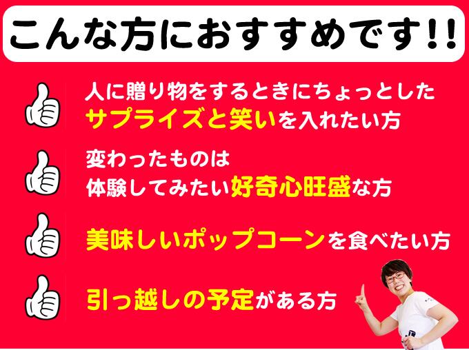 緩衝材となるポップコーンはサクッとして、いい”あんばい”の塩味で、止まらなくなります。